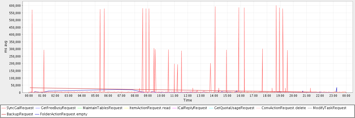 avg(SyncGalRequest) = 16004.01 avg(GetFreeBusyRequest) = 559.29 avg(MaintainTablesRequest) = 297554.00 avg(ItemActionRequest.read) = 475.50 avg(ICalReplyRequest) = 399.25 avg(GetQuotaUsageRequest) = 3669.00 avg(ConvActionRequest.delete) = 444.06 avg(ModifyTaskRequest) = 621.00 avg(BackupRequest) = 16596.00 avg(FolderActionRequest.empty) = 2625.68