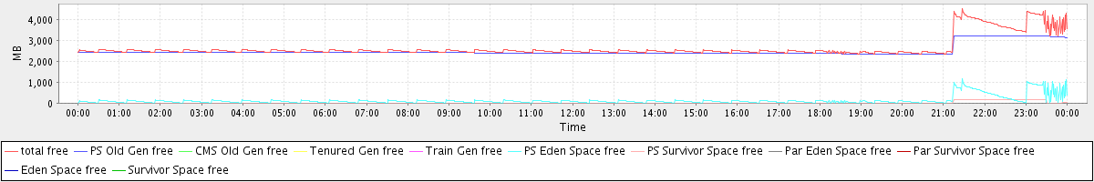avg(total free) = 2648.32 avg(PS Old Gen free) = 2502.54 avg(CMS Old Gen free) = 0.00 avg(Tenured Gen free) = 0.00 avg(Train Gen free) = 0.00 avg(PS Eden Space free) = 127.76 avg(PS Survivor Space free) = 18.02 avg(Par Eden Space free) = 0.00 avg(Par Survivor Space free) = 0.00 avg(Eden Space free) = 0.00 avg(Survivor Space free) = 0.00