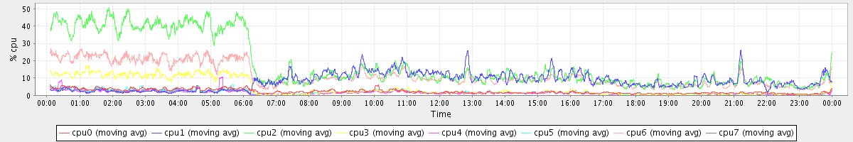 avg(cpu0) = 2.04 avg(cpu1) = 0.29 avg(cpu2) = 0.34 avg(cpu3) = 0.23 avg(cpu4) = 0.15 avg(cpu5) = 0.20 avg(cpu6) = 0.27 avg(cpu7) = 0.19