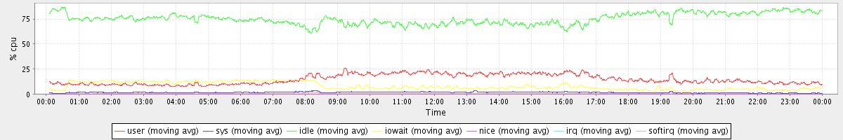 avg(user) = 14.63 avg(sys) = 1.62 avg(idle) = 75.20 avg(iowait) = 7.90 avg(nice) = 0.00 avg(irq) = 0.06 avg(softirq) = 0.60