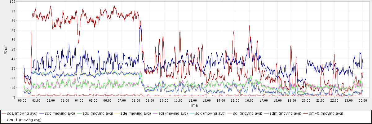 avg(sda) = 1.75 avg(sdc) = 12.18 avg(sdd) = 12.01 avg(sde) = 12.18 avg(sdj) = 12.06 avg(sdk) = 12.25 avg(sdl) = 12.08 avg(sdm) = 12.20 avg(dm-0) = 43.65 avg(dm-1) = 34.24
