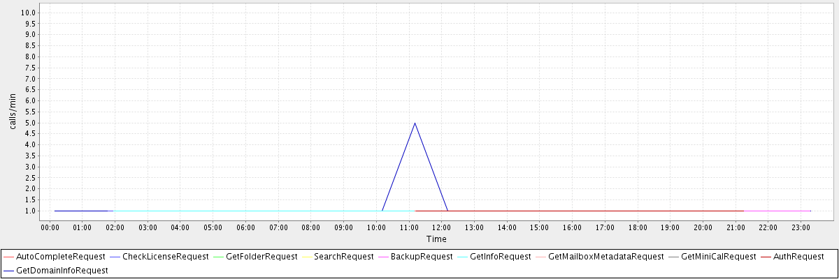 max(AutoCompleteRequest) = 1.00 max(CheckLicenseRequest) = 1.00 max(GetFolderRequest) = 10.00 max(SearchRequest) = 2.00 max(BackupRequest) = 1.00 max(GetInfoRequest) = 1.00 max(GetMailboxMetadataRequest) = 1.00 max(GetMiniCalRequest) = 1.00 max(AuthRequest) = 1.00 max(GetDomainInfoRequest) = 5.00