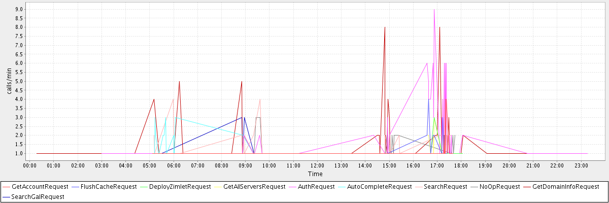 max(GetAccountRequest) = 4.00 max(FlushCacheRequest) = 4.00 max(DeployZimletRequest) = 3.00 max(GetAllServersRequest) = 3.00 max(AuthRequest) = 9.00 max(AutoCompleteRequest) = 3.00 max(SearchRequest) = 4.00 max(NoOpRequest) = 3.00 max(GetDomainInfoRequest) = 8.00 max(SearchGalRequest) = 3.00