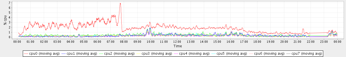avg(cpu0) = 0.21 avg(cpu1) = 0.03 avg(cpu2) = 0.11 avg(cpu3) = 0.02 avg(cpu4) = 0.00 avg(cpu5) = 0.00 avg(cpu6) = 0.07 avg(cpu7) = 0.00