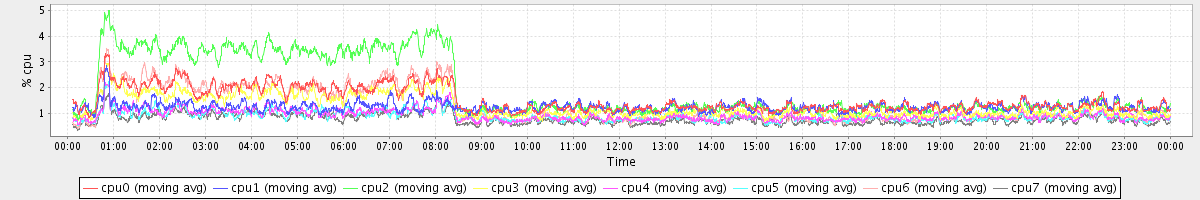 avg(cpu0) = 1.69 avg(cpu1) = 0.19 avg(cpu2) = 0.30 avg(cpu3) = 0.18 avg(cpu4) = 0.18 avg(cpu5) = 0.14 avg(cpu6) = 0.20 avg(cpu7) = 0.16