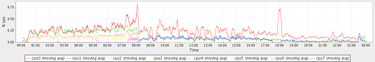avg(cpu0) = 2.11 avg(cpu1) = 0.27 avg(cpu2) = 0.36 avg(cpu3) = 0.26 avg(cpu4) = 0.20 avg(cpu5) = 0.21 avg(cpu6) = 0.28 avg(cpu7) = 0.18