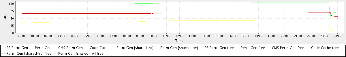 avg(PS Perm Gen) = 0.00 avg(Perm Gen) = 0.00 avg(CMS Perm Gen) = 101.00 avg(Code Cache) = 40.65 avg(Perm Gen [shared-ro]) = 0.00 avg(Perm Gen [shared-rw]) = 0.00 avg(PS Perm Gen free) = 0.00 avg(Perm Gen free) = 0.00 avg(CMS Perm Gen free) = 67.72 avg(Code Cache free) = 0.42 avg(Perm Gen [shared-ro] free) = 0.00 avg(Perm Gen [shared-rw] free) = 0.00