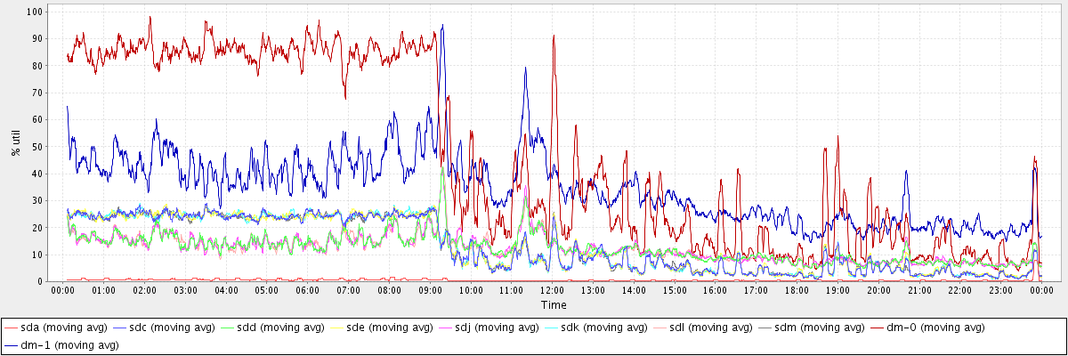 avg(sda) = 0.54 avg(sdc) = 12.99 avg(sdd) = 12.34 avg(sde) = 13.03 avg(sdj) = 12.30 avg(sdk) = 13.02 avg(sdl) = 12.28 avg(sdm) = 12.89 avg(dm-0) = 45.93 avg(dm-1) = 34.52
