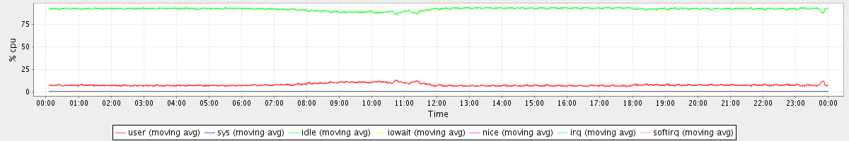 avg(user) = 7.72 avg(sys) = 0.61 avg(idle) = 91.57 avg(iowait) = 0.02 avg(nice) = 0.00 avg(irq) = 0.00 avg(softirq) = 0.07