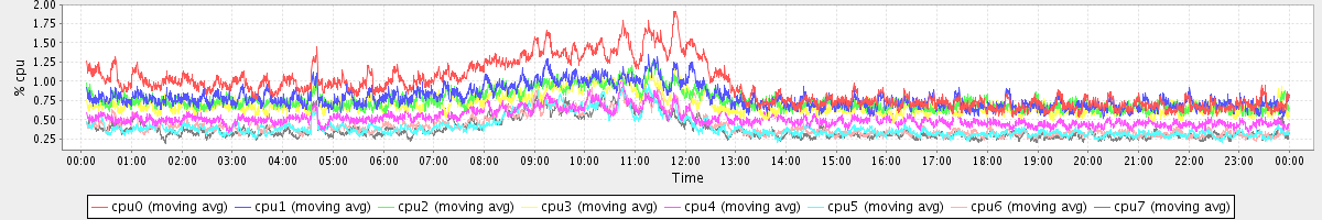 avg(cpu0) = 0.94 avg(cpu1) = 0.78 avg(cpu2) = 0.75 avg(cpu3) = 0.70 avg(cpu4) = 0.52 avg(cpu5) = 0.40 avg(cpu6) = 0.42 avg(cpu7) = 0.38