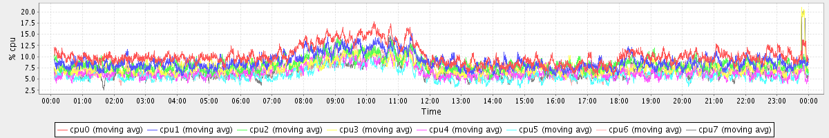 avg(cpu0) = 10.15 avg(cpu1) = 8.85 avg(cpu2) = 8.34 avg(cpu3) = 7.75 avg(cpu4) = 6.73 avg(cpu5) = 6.08 avg(cpu6) = 7.10 avg(cpu7) = 6.74