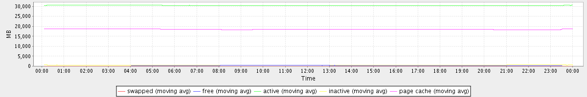 avg(swapped) = 0.25 avg(free) = 280.04 avg(active) = 30469.75 avg(inactive) = 558.62 avg(page cache) = 18486.55