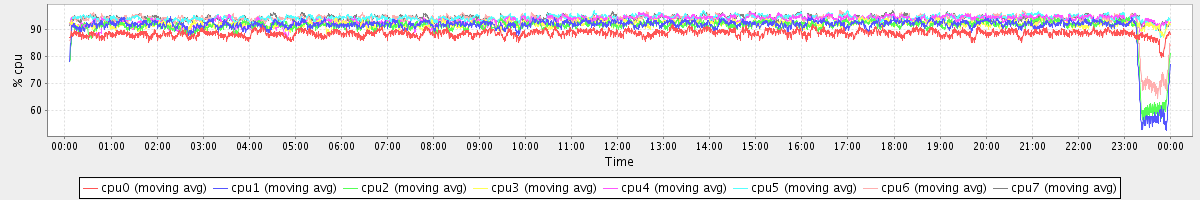 avg(cpu0) = 88.54 avg(cpu1) = 90.92 avg(cpu2) = 90.79 avg(cpu3) = 91.92 avg(cpu4) = 93.26 avg(cpu5) = 94.14 avg(cpu6) = 93.38 avg(cpu7) = 94.13