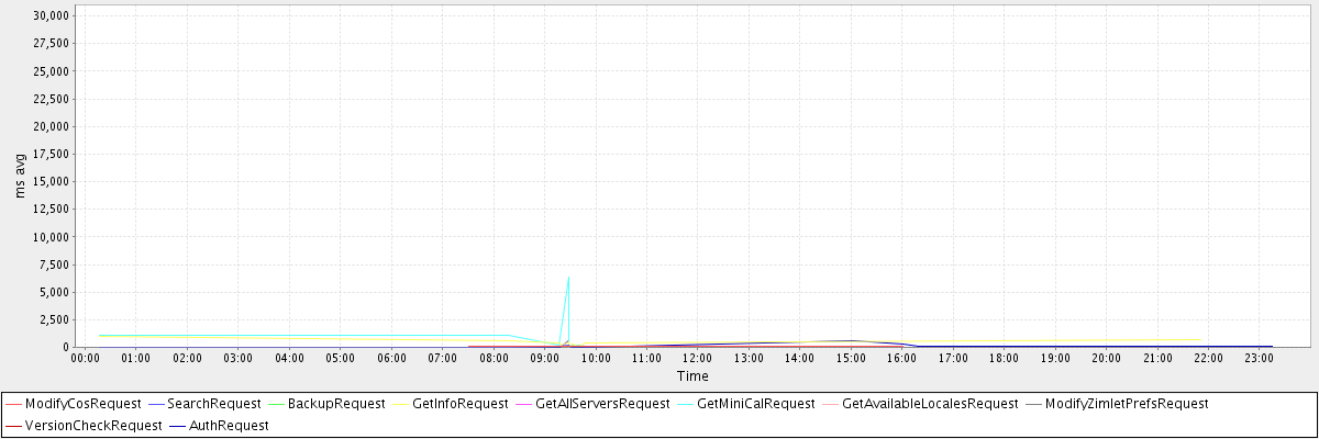 avg(ModifyCosRequest) = 120.50 avg(SearchRequest) = 89.50 avg(BackupRequest) = 29581.00 avg(GetInfoRequest) = 401.09 avg(GetAllServersRequest) = 57.00 avg(GetMiniCalRequest) = 1061.78 avg(GetAvailableLocalesRequest) = 167.00 avg(ModifyZimletPrefsRequest) = 223.00 avg(VersionCheckRequest) = 415.00 avg(AuthRequest) = 100.17