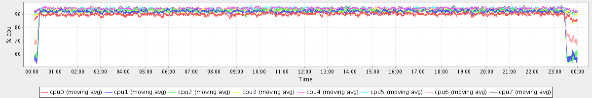 avg(cpu0) = 90.05 avg(cpu1) = 90.99 avg(cpu2) = 91.42 avg(cpu3) = 92.32 avg(cpu4) = 94.12 avg(cpu5) = 94.13 avg(cpu6) = 93.21 avg(cpu7) = 94.10