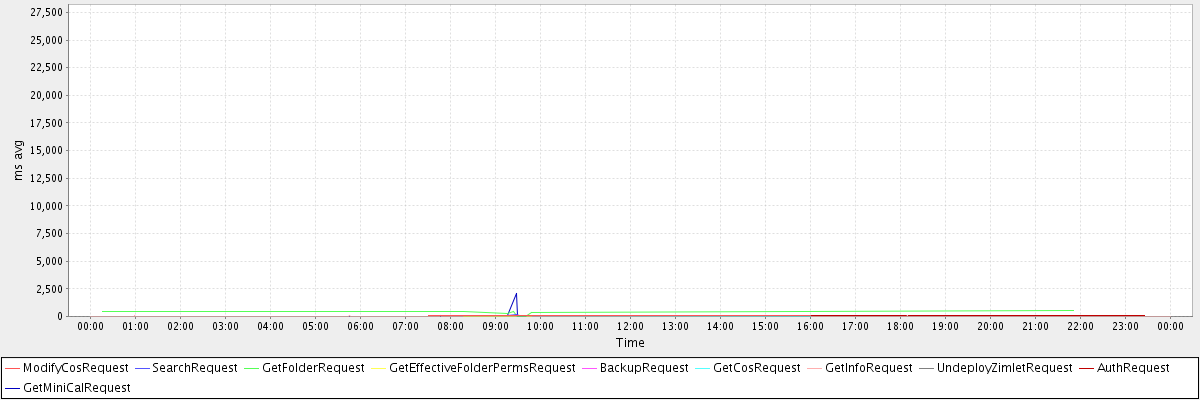 max(SearchRequest) = 3.00 max(GetFolderRequest) = 9.00 max(GetEffectiveFolderPermsRequest) = 6.00 max(BackupRequest) = 1.00 max(GetCosRequest) = 1.00 max(GetInfoRequest) = 2.00 max(UndeployZimletRequest) = 1.00 max(AuthRequest) = 3.00 max(GetMiniCalRequest) = 3.00 max(GetDomainInfoRequest) = 3.00