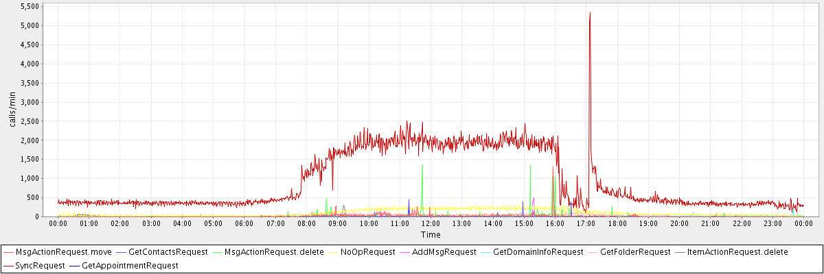 max(MsgActionRequest.move) = 1312.00 max(GetContactsRequest) = 444.00 max(MsgActionRequest.delete) = 1358.00 max(NoOpRequest) = 301.00 max(AddMsgRequest) = 507.00 max(GetDomainInfoRequest) = 219.00 max(GetFolderRequest) = 309.00 max(ItemActionRequest.delete) = 312.00 max(SyncRequest) = 5334.00 max(GetAppointmentRequest) = 255.00
