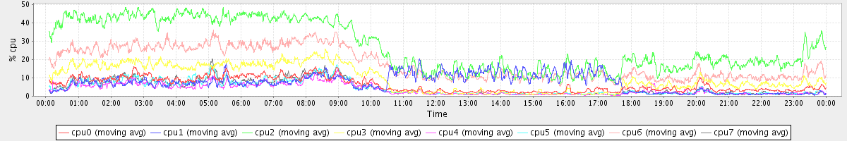 avg(cpu0) = 6.19 avg(cpu1) = 7.36 avg(cpu2) = 27.25 avg(cpu3) = 9.73 avg(cpu4) = 3.69 avg(cpu5) = 4.44 avg(cpu6) = 17.74 avg(cpu7) = 4.63