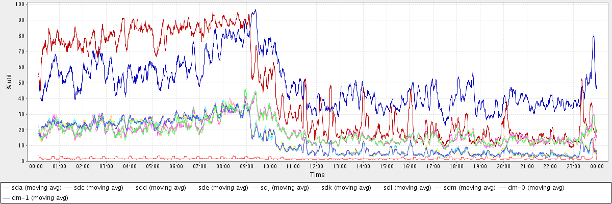avg(sda) = 1.89 avg(sdc) = 14.19 avg(sdd) = 18.72 avg(sde) = 14.19 avg(sdj) = 18.68 avg(sdk) = 14.11 avg(sdl) = 18.75 avg(sdm) = 14.22 avg(dm-0) = 45.24 avg(dm-1) = 49.51