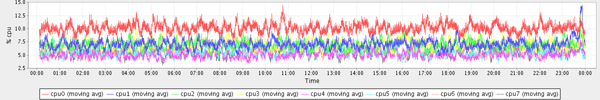 avg(cpu0) = 10.10 avg(cpu1) = 7.03 avg(cpu2) = 6.94 avg(cpu3) = 7.00 avg(cpu4) = 5.10 avg(cpu5) = 5.49 avg(cpu6) = 5.53 avg(cpu7) = 5.43