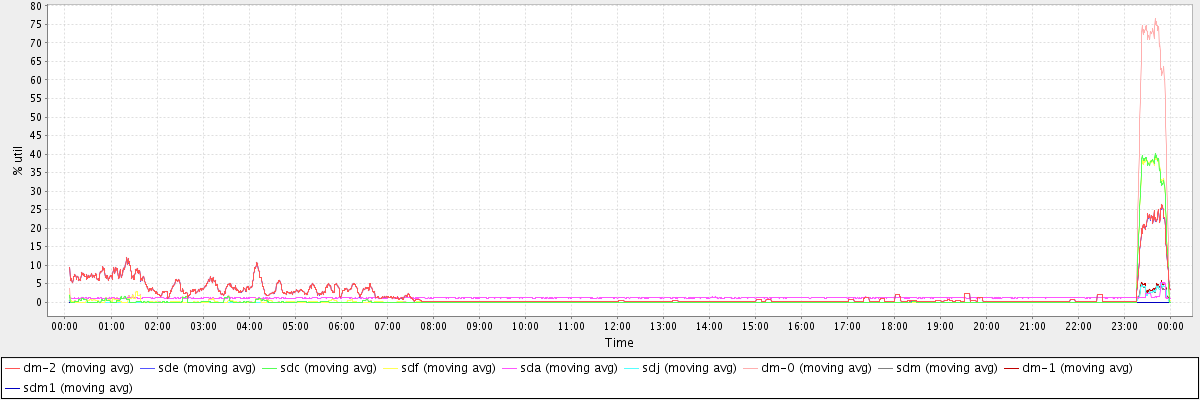 avg(dm-2) = 2.12 avg(sde) = 2.11 avg(sdc) = 1.00 avg(sdf) = 1.01 avg(sda) = 1.22 avg(sdj) = 0.09 avg(dm-0) = 1.93 avg(sdm) = 0.09 avg(dm-1) = 0.11 avg(sdm1) = 0.00