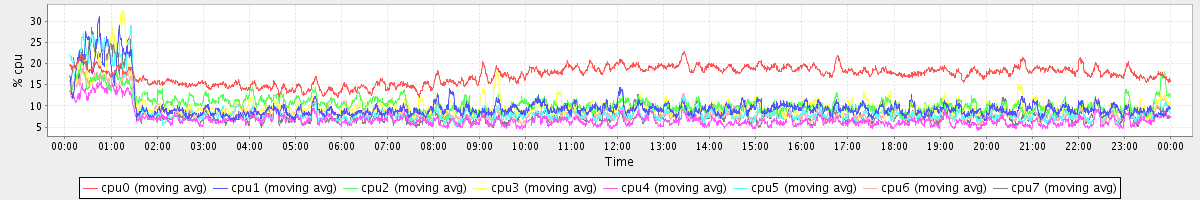 avg(cpu0) = 1.45 avg(cpu1) = 0.14 avg(cpu2) = 0.20 avg(cpu3) = 0.11 avg(cpu4) = 0.07 avg(cpu5) = 0.08 avg(cpu6) = 0.13 avg(cpu7) = 0.08