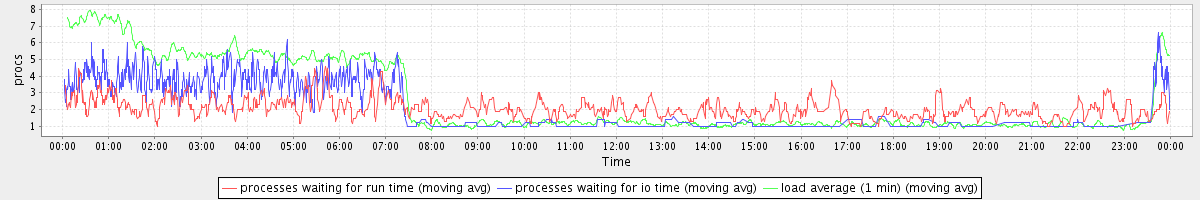 avg(processes waiting for run time) = 1.04 avg(processes waiting for io time) = 1.28 avg(load average (1 min)) = 2.59