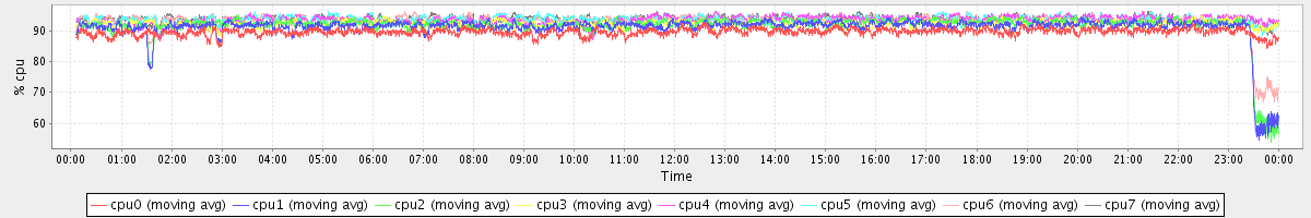 avg(cpu0) = 89.62 avg(cpu1) = 90.92 avg(cpu2) = 91.45 avg(cpu3) = 92.17 avg(cpu4) = 93.37 avg(cpu5) = 93.68 avg(cpu6) = 93.08 avg(cpu7) = 93.77