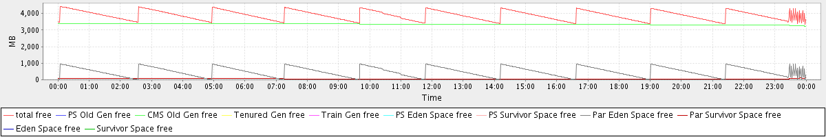 avg(total free) = 3888.13 avg(PS Old Gen free) = 0.00 avg(CMS Old Gen free) = 3349.34 avg(Tenured Gen free) = 0.00 avg(Train Gen free) = 0.00 avg(PS Eden Space free) = 0.00 avg(PS Survivor Space free) = 0.00 avg(Par Eden Space free) = 484.17 avg(Par Survivor Space free) = 54.62 avg(Eden Space free) = 0.00 avg(Survivor Space free) = 0.00