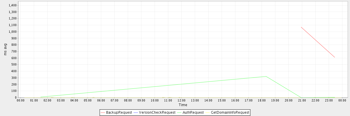 avg(BackupRequest) = 841.50 avg(VersionCheckRequest) = 1393.00 avg(AuthRequest) = 83.50 avg(GetDomainInfoRequest) = 0.27