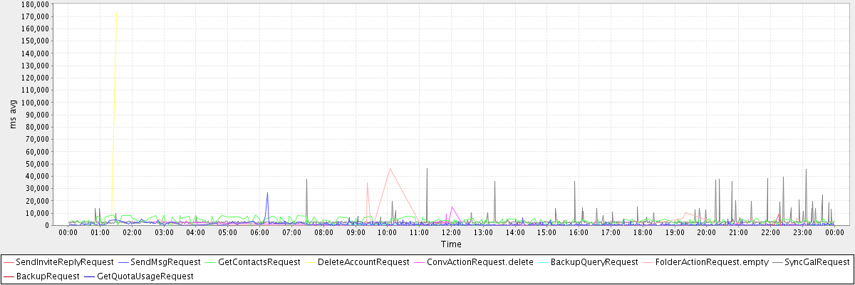 avg(SendInviteReplyRequest) = 2170.40 avg(SendMsgRequest) = 902.84 avg(GetContactsRequest) = 1277.90 avg(DeleteAccountRequest) = 88309.50 avg(ConvActionRequest.delete) = 1051.53 avg(BackupQueryRequest) = 595.00 avg(FolderActionRequest.empty) = 3367.64 avg(SyncGalRequest) = 3236.27 avg(BackupRequest) = 1062.00 avg(GetQuotaUsageRequest) = 1046.00