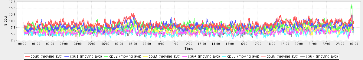 avg(cpu0) = 8.83 avg(cpu1) = 7.88 avg(cpu2) = 7.83 avg(cpu3) = 7.02 avg(cpu4) = 5.90 avg(cpu5) = 5.45 avg(cpu6) = 6.25 avg(cpu7) = 6.05