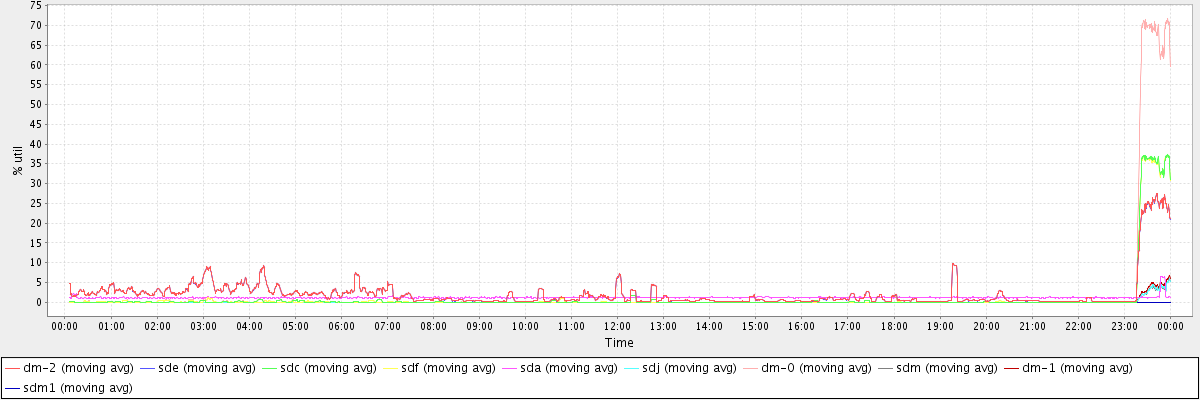 avg(dm-2) = 2.22 avg(sde) = 2.21 avg(sdc) = 1.12 avg(sdf) = 1.11 avg(sda) = 1.21 avg(sdj) = 0.11 avg(dm-0) = 2.15 avg(sdm) = 0.10 avg(dm-1) = 0.13 avg(sdm1) = 0.00