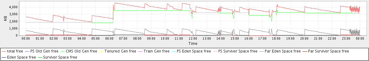 avg(total free) = 3431.02 avg(PS Old Gen free) = 0.00 avg(CMS Old Gen free) = 2888.50 avg(Tenured Gen free) = 0.00 avg(Train Gen free) = 0.00 avg(PS Eden Space free) = 0.00 avg(PS Survivor Space free) = 0.00 avg(Par Eden Space free) = 485.27 avg(Par Survivor Space free) = 57.26 avg(Eden Space free) = 0.00 avg(Survivor Space free) = 0.00