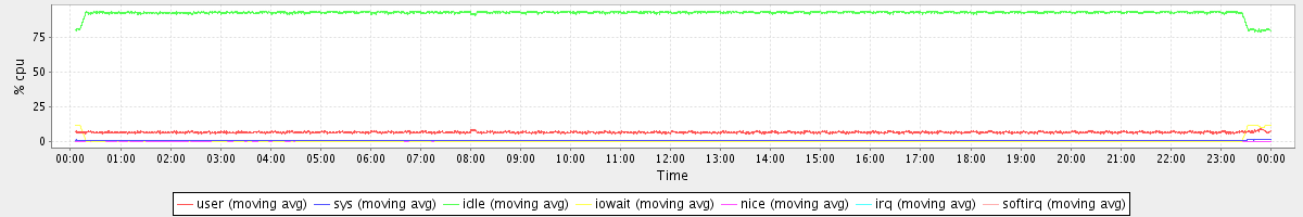 avg(user) = 6.55 avg(sys) = 0.59 avg(idle) = 92.38 avg(iowait) = 0.47 avg(nice) = 0.00 avg(irq) = 0.00 avg(softirq) = 0.00