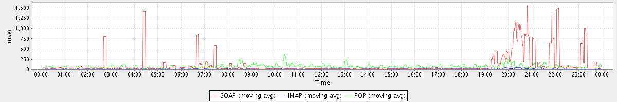 max(MsgActionRequest.move) = 236.00 max(SearchRequest) = 335.00 max(MsgActionRequest.delete) = 1482.00 max(NoOpRequest) = 304.00 max(GetInfoRequest) = 279.00 max(GetFreeBusyRequest) = 172.00 max(GetDomainInfoRequest) = 305.00 max(SyncRequest) = 2289.00 max(AuthRequest) = 277.00 max(GetAppointmentRequest) = 484.00