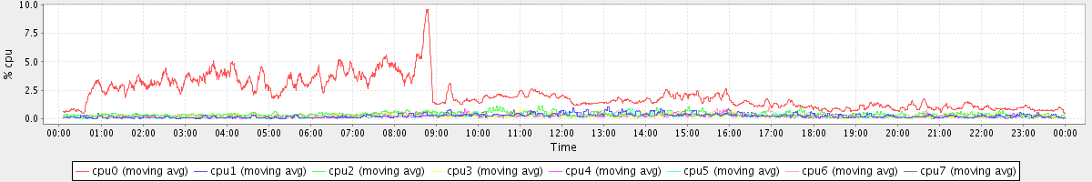 avg(cpu0) = 2.13 avg(cpu1) = 0.25 avg(cpu2) = 0.38 avg(cpu3) = 0.22 avg(cpu4) = 0.18 avg(cpu5) = 0.17 avg(cpu6) = 0.27 avg(cpu7) = 0.20