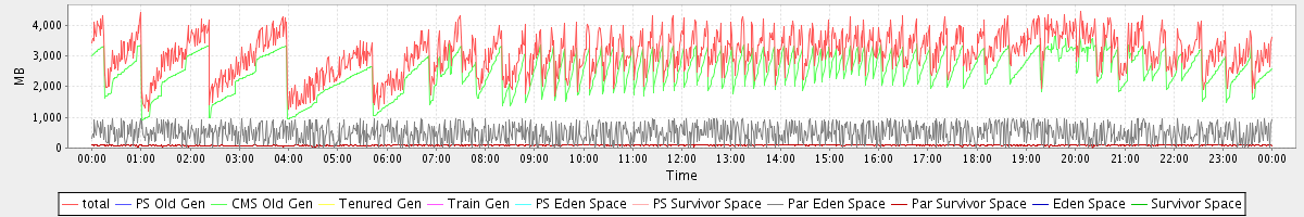 avg(total) = 3067.14 avg(PS Old Gen) = 0.00 avg(CMS Old Gen) = 2484.53 avg(Tenured Gen) = 0.00 avg(Train Gen) = 0.00 avg(PS Eden Space) = 0.00 avg(PS Survivor Space) = 0.00 avg(Par Eden Space) = 490.66 avg(Par Survivor Space) = 91.95 avg(Eden Space) = 0.00 avg(Survivor Space) = 0.00