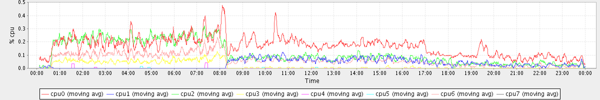 avg(cpu0) = 1.96 avg(cpu1) = 0.25 avg(cpu2) = 0.35 avg(cpu3) = 0.23 avg(cpu4) = 0.21 avg(cpu5) = 0.18 avg(cpu6) = 0.27 avg(cpu7) = 0.19