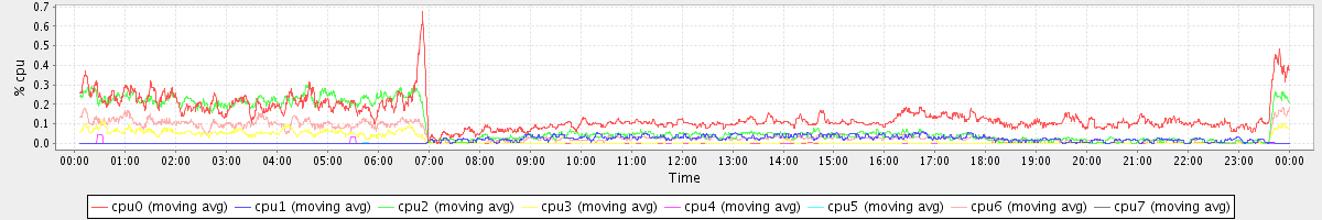 avg(cpu0) = 1.38 avg(cpu1) = 0.18 avg(cpu2) = 0.25 avg(cpu3) = 0.16 avg(cpu4) = 0.08 avg(cpu5) = 0.12 avg(cpu6) = 0.18 avg(cpu7) = 0.11