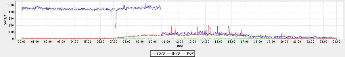 Host zm05.stanford.edu: Mailboxd: Request Rate by Client Protocol