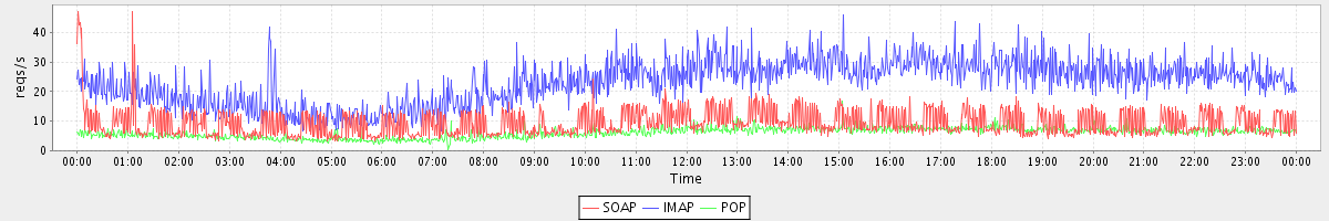 Host zm03.stanford.edu: Mailboxd: Request Rate by Client Protocol