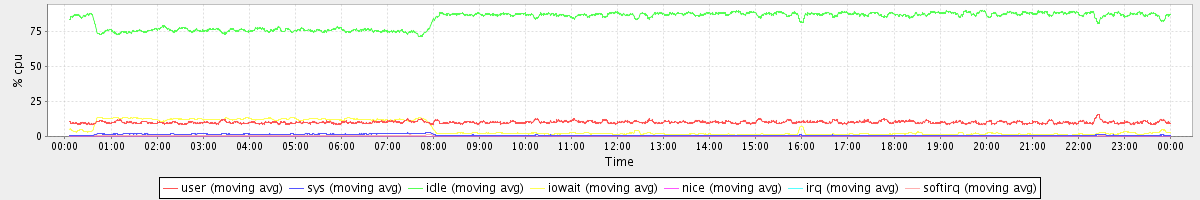 avg(user) = 10.05 avg(sys) = 1.12 avg(idle) = 83.34 avg(iowait) = 5.12 avg(nice) = 0.00 avg(irq) = 0.03 avg(softirq) = 0.35
