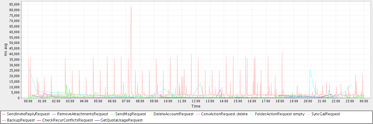avg(SendInviteReplyRequest) = 472.00 avg(RemoveAttachmentsRequest) = 1509.00 avg(SendMsgRequest) = 800.92 avg(DeleteAccountRequest) = 2614.00 avg(ConvActionRequest.delete) = 528.48 avg(FolderActionRequest.empty) = 3731.42 avg(SyncGalRequest) = 4142.30 avg(BackupRequest) = 792.00 avg(CheckRecurConflictsRequest) = 819.00 avg(GetQuotaUsageRequest) = 1178.00
