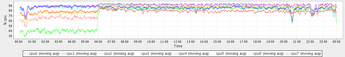 avg(cpu0) = 78.73 avg(cpu1) = 85.94 avg(cpu2) = 72.63 avg(cpu3) = 85.37 avg(cpu4) = 91.23 avg(cpu5) = 88.81 avg(cpu6) = 81.25 avg(cpu7) = 89.71