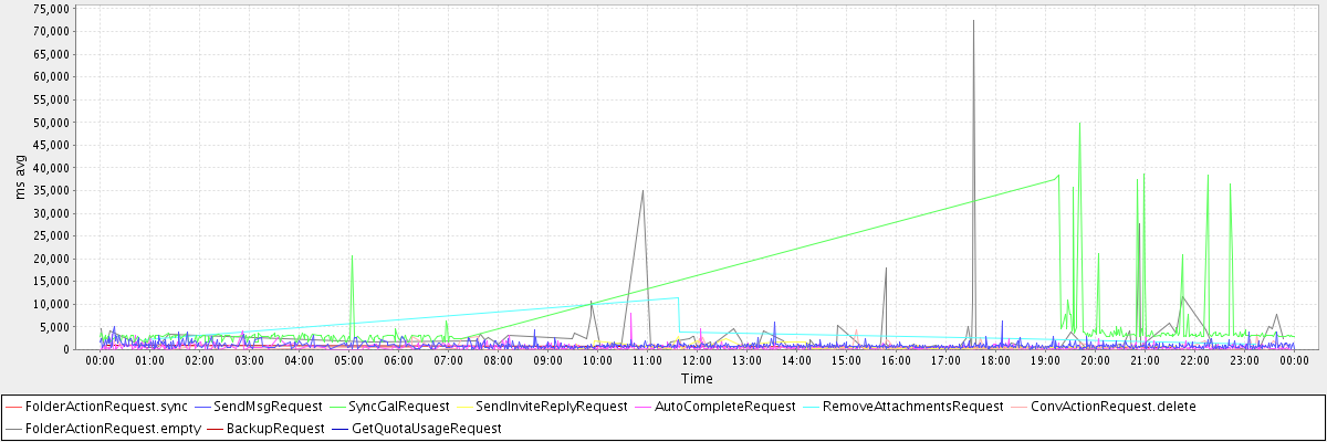 avg(FolderActionRequest.sync) = 15956.00 avg(SendMsgRequest) = 915.42 avg(SyncGalRequest) = 4140.43 avg(SendInviteReplyRequest) = 929.86 avg(AutoCompleteRequest) = 486.22 avg(RemoveAttachmentsRequest) = 4174.20 avg(ConvActionRequest.delete) = 525.86 avg(FolderActionRequest.empty) = 2769.85 avg(BackupRequest) = 745.00 avg(GetQuotaUsageRequest) = 1087.00