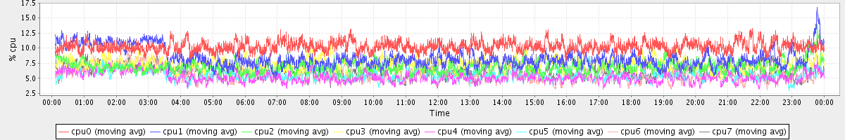avg(cpu0) = 10.24 avg(cpu1) = 8.33 avg(cpu2) = 6.90 avg(cpu3) = 7.36 avg(cpu4) = 5.24 avg(cpu5) = 5.64 avg(cpu6) = 5.59 avg(cpu7) = 6.13
