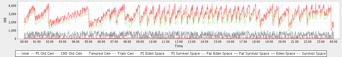 avg(total) = 2976.42 avg(PS Old Gen) = 0.00 avg(CMS Old Gen) = 2407.74 avg(Tenured Gen) = 0.00 avg(Train Gen) = 0.00 avg(PS Eden Space) = 0.00 avg(PS Survivor Space) = 0.00 avg(Par Eden Space) = 479.02 avg(Par Survivor Space) = 89.65 avg(Eden Space) = 0.00 avg(Survivor Space) = 0.00