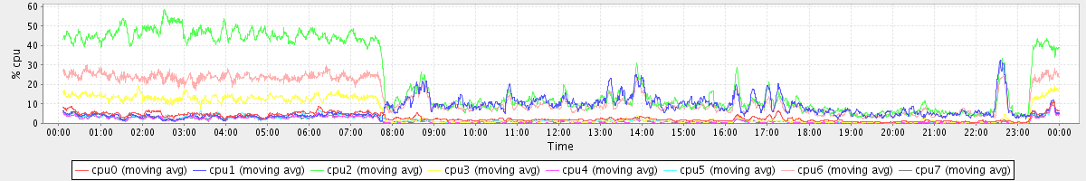avg(cpu0) = 1.46 avg(cpu1) = 0.20 avg(cpu2) = 0.29 avg(cpu3) = 0.15 avg(cpu4) = 0.12 avg(cpu5) = 0.13 avg(cpu6) = 0.20 avg(cpu7) = 0.11
