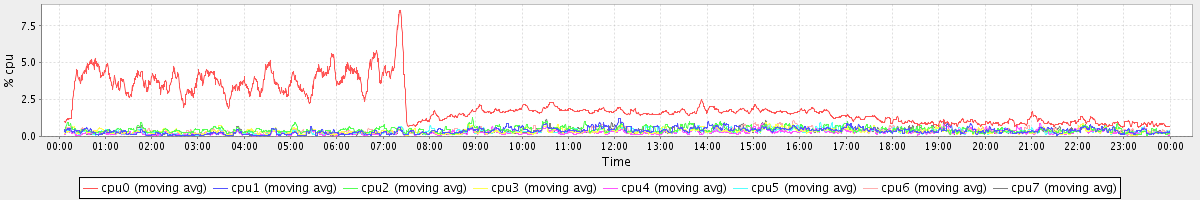 avg(cpu0) = 2.12 avg(cpu1) = 0.38 avg(cpu2) = 0.45 avg(cpu3) = 0.35 avg(cpu4) = 0.27 avg(cpu5) = 0.32 avg(cpu6) = 0.38 avg(cpu7) = 0.32